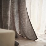 Κουρτίνα υψηλής σκίασης από ύφασμα με minimal σταυρωτή πλέξη. Ραμμένη με ματ ασημί τρουκς.